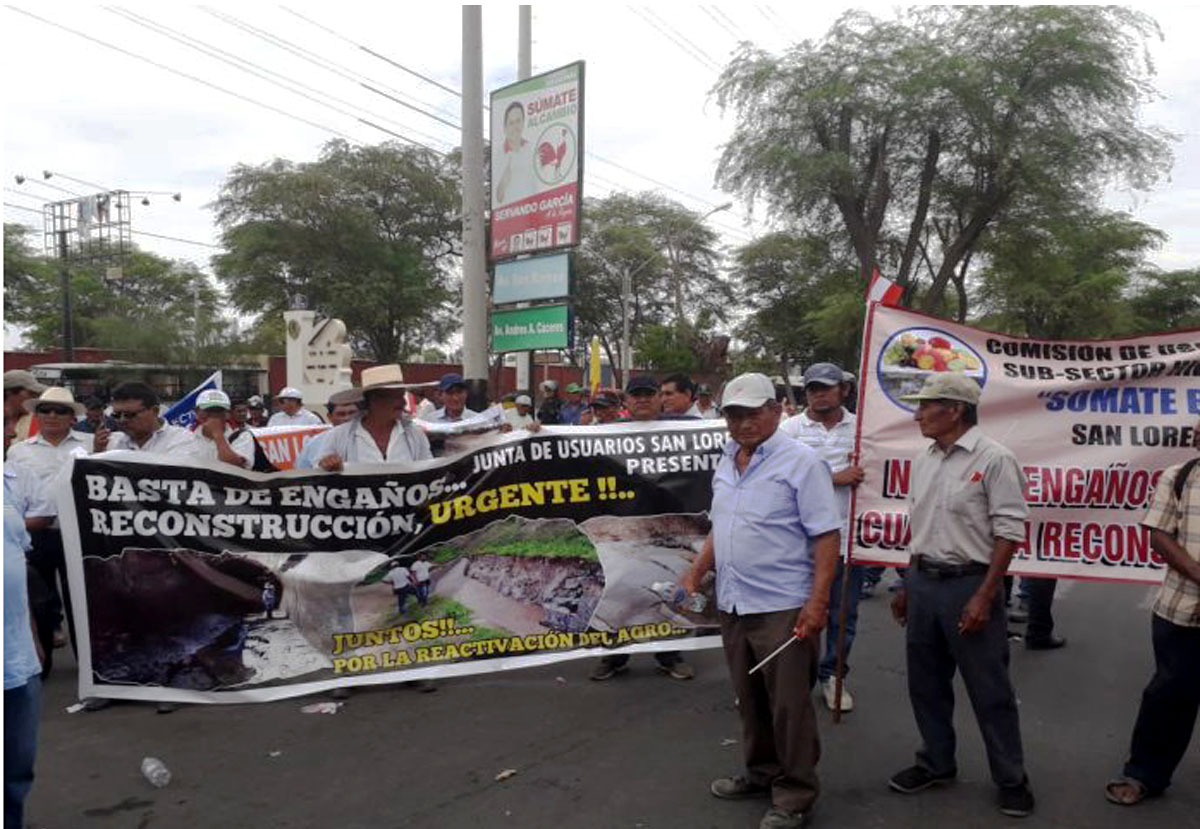 Más de 2500 agricultores de la región Piura, en el norte del Perú realizaron el lunes 28 una movilización por las principales calles de las ciudades de Castilla y Piura, exigiendo al ministerio de Agricultura y la Autoridad para la Reconstrucción con Cambios (ARCC), que se ejecuten las obras de reconstrucción de la infraestructura de riego, destruida por el Niño Costero del año 2017. Los reclamos centrales son la reconstrucción de los sistemas de riego para que el agricultor pueda sembrar, precios justos en la comercialización, y créditos oportunos para que el pequeño agricultor instale sus cultivos.