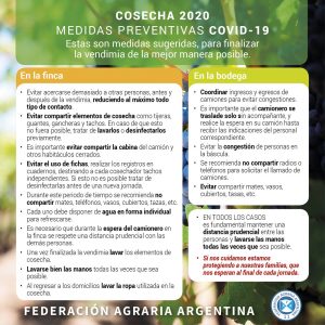 En uno, general, unifica las acciones de prevención que deben observar los productores para preservarse durante la realización de sus tareas. En otro, específico para las actividades vinculadas a la cosecha de vid, que se desarrolla en este momento, refiere a esta producción en particular. Ambos fueron difundidos entre los productores y también enviados a los medios de comunicación, con muy buena acogida, puesto que hasta ese momento no se había hecho pública mucha información al respecto.
