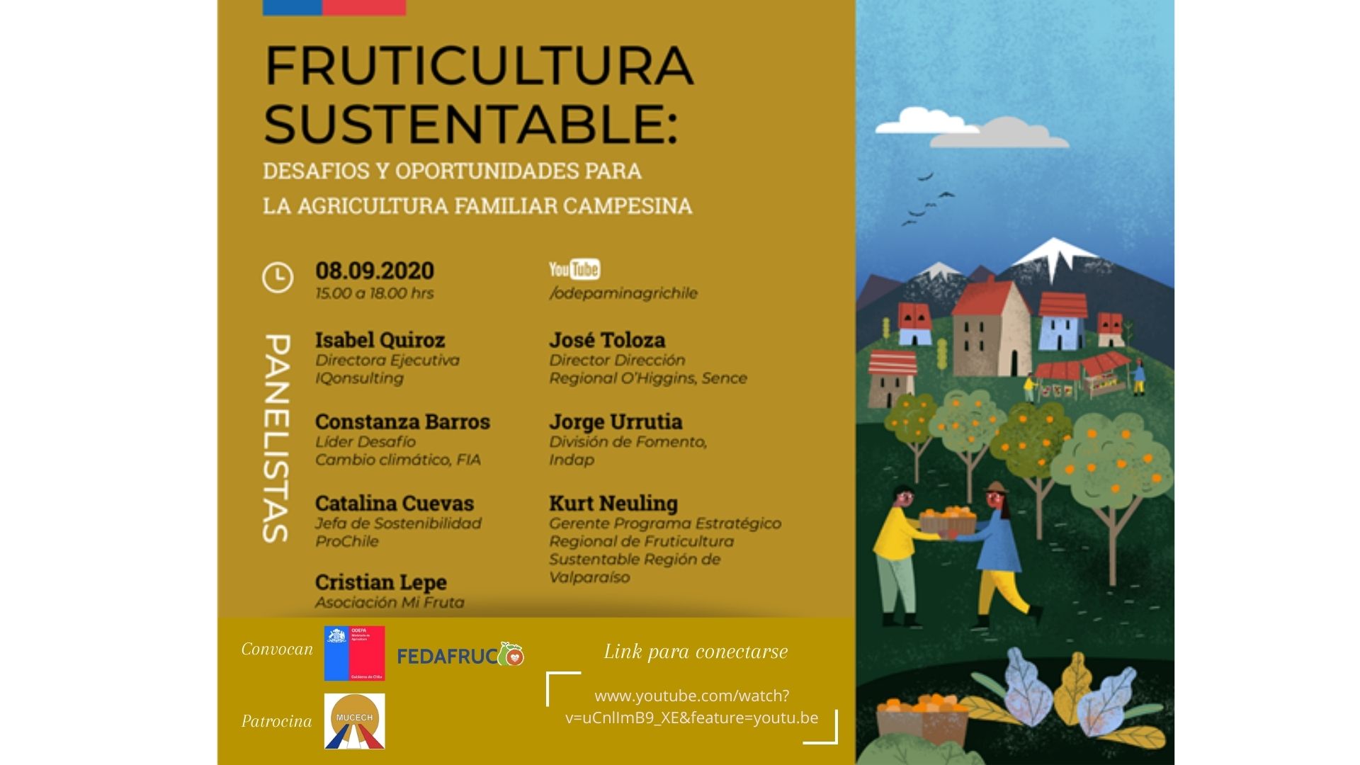El 8 de septiembre se llevará a cabo el seminario “Fruticultura Sustentable” entre las 15:00 y 18:00 hrs a través de este link de Youtube. En él se abordarán los desafíos y oportunidades que se vienen para la agricultura familiar campesina (AFC). Los panelistas serán Cristian Lepe (Asociación Mi Fruta), Kurt Neuling (Gerente Programa Estratégico Regional de Fruticultura Sustentable Región de Valparaíso), Jorge Urrutia (INDAP, División de Fomento), Catalina Cuevas (Jefa de Sostenibilidad ProChile), Constanza Barros (FIA, Líder Desafío Cambio Climático), José Toloza (SENCE, Director Dirección Regional O’Higgins) e Isabel Quiroz (Directora Ejecutiva IQonsulting). La actividad será convocada por la Oficina de Estudios y Políticas Agrarias (ODEPA) y la Federación Nacional de la Fruticultura Familiar Campesina (FEDAFRUC). De la misma forma, será patrocinada por el Movimiento Unitario Campesino y Etnias de Chile (MUCECH nacional y regionales).