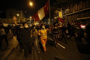 Las manifestaciones en Lima se concentraron en la céntrica Plaza San Martín en pleno centro de Lima y luego se trasladaron hasta la sede del Congreso de la República, en donde numerosos grupos de la policía trataron de impedir el avance de los manifestantes que lanzaban consignas contra Manuel Merino, al que acusaron de golpista.