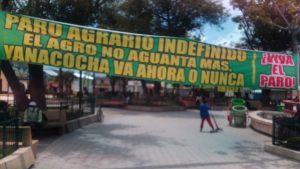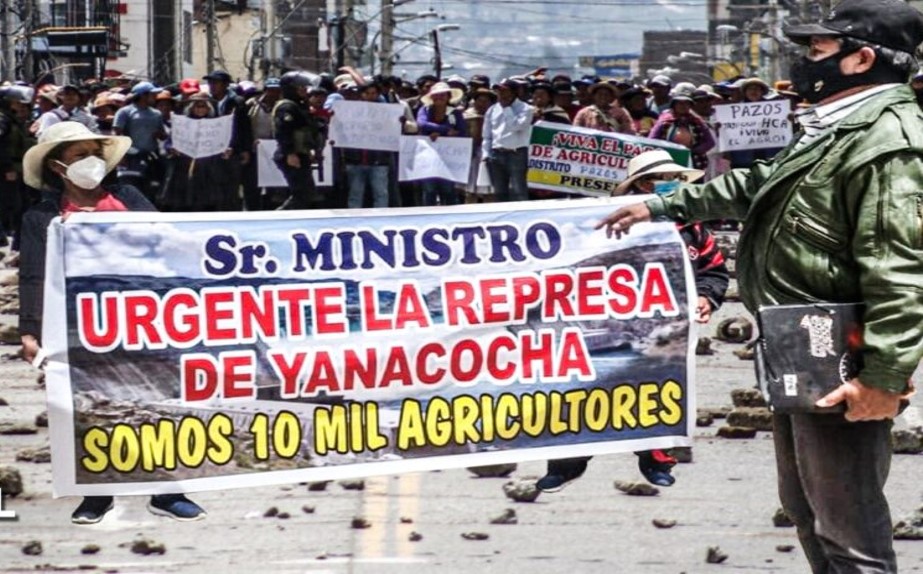 Más de tres mis agricultores del Valle del Cunas, en la región Junín en el centro del país, iniciaron un paro agrario y bloquearon un tramo de 10 Kilómetros de la carretera Chupaca-Yauyos, con tractores, troncos y piedras, exigiendo la construcción urgente del proyecto hídrico Yanacocha.