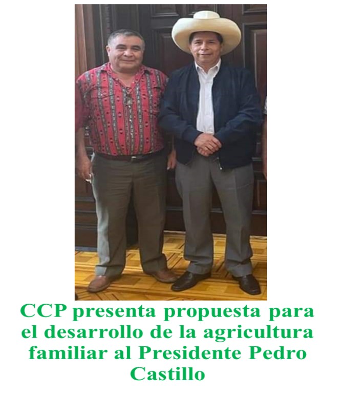 La CCP saluda que su Gobierno, compañero Presidente, ha reorientado la política del Ministerio de Agricultura convirtiendo el prioritaria la pequeña producción campesina de Agricultura Familiar que representa el 97% de los 2 millones 300 mil unidades productivas que posee el Perú. Tenemos mucha expectativa para que esta orientación se exprese en cambios reales y concretos. La CCP tiene experiencias y propuestas de cambio innovador y emprendedor que deseamos aportar.