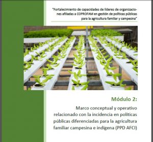 El curso que tuvo una duración de tres meses, se realizó en la modalidad virtual a través de la plataforma interactiva del IICA, y se desarrolló a través de cuatro módulos formativos que abordaron diferentes temas orientados a fortalecer las capacidades de los líderes y dirigentes de las organizaciones de base de COPROFAM y de la CCP para incidir en la implementación de políticas públicas a favor de la agricultura familiar, campesina e indígena.