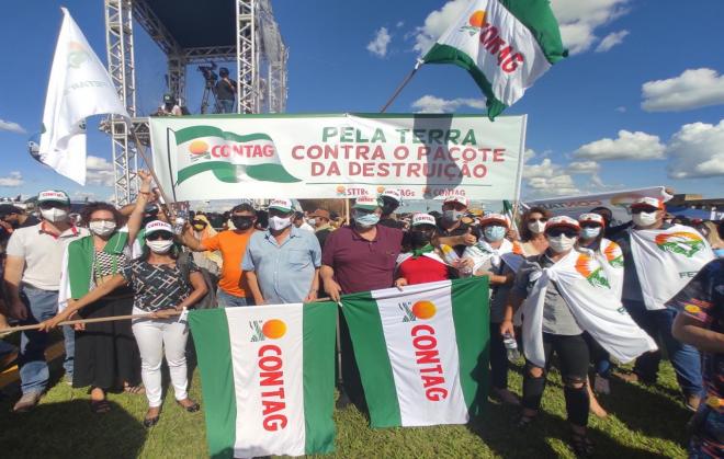 En el “Acto por la Tierra Contra el Paquete de Destrucción” también estuvieron presentes el vicepresidente y secretario de Relaciones Internacionales de la CONTAG Alberto Broch, la secretaria de la Juventud Mônica Bufon y empleados de la Confederación, el presidente de la CONTAR Gabriel Santos y dirigentes de las Federaciones de los/las Asalariados(as).