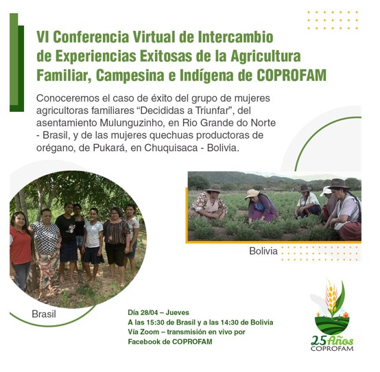 La COPROFAM le invita a participar de la 6ª Conferencias de Intercambio de Experiencias Exitosas de la Agricultura Familiar, Campesina e Indígena (AFCI)” que se realizará el día jueves 28 de abril, a las 15:30 horas de Uruguay, Argentina, Chile y Brasil, 13:30 horas de Perú y 14:30 horas de Bolivia, Paraguay y Chile.