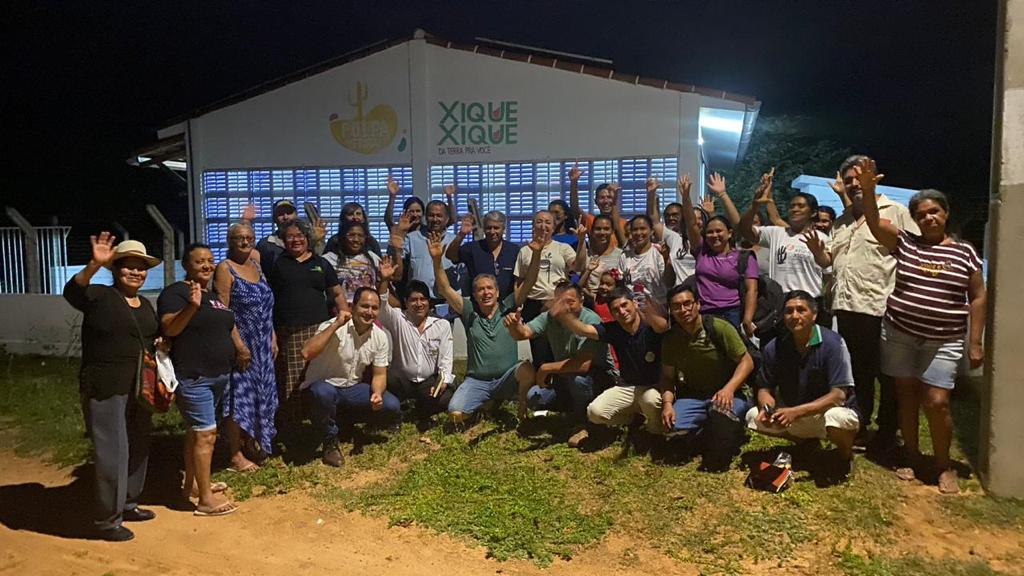 Por la tarde, la delegación se dirigió al Asentamiento Mulunguzinho, en la zona rural de Mossoró, para visitar la unidad de procesamiento de pulpa de frutas, que procesa las frutas producidas en los traspatios productivos. Hubo una ronda de presentaciones y relatos rápidos sobre las experiencias de cada país, principalmente los relatos de las mujeres del Asentamiento de Mulunguzinho, que trajeron discursos locales del grupo de Mujeres Decididas a Triunfar que dieron una guía sobre cómo se vive la situación económica, socioambiental y transformaciones sociales ocurrieron políticas, cuando trajeron detalles sobre el enriquecimiento de los traspatios para una mayor producción de alimentos, huerta colectiva del asentamiento, formación del grupo de apicultores locales, grupos productores de miel y pulpa de frutas y sobre la experiencia exitosa de la “Oro da Paz” (proyecto grupal de microcrédito comunitario) liderado por mujeres que se reúnen semanalmente en asamblea para administrar colectivamente sus ahorros y deliberar sobre temas relacionados con el funcionamiento del grupo. Seguidamente, se realizó una visita a la unidad de procesamiento de pulpa de frutas, donde se presentó todo el organigrama operativo, etapas del proceso de higiene personal en el ambiente de trabajo, sobre el manejo de la unidad y varios detalles más.