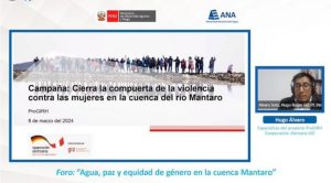 Como parte de las conmemoraciones por el Día Internacional de la Mujer, ese 8 de marzo se realizó en la ciudad Huancayo el Foro “Agua para la paz con equidad de género en la cuenca del río Mantaro”, el mismo que tuvo como objetivo visibilizar la contribución de las mujeres en la promoción de la paz y la seguridad hídrica en esta importante cuenca del centro del país.