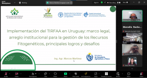 Por último, el Ing. Agr. Marcos Martínez, Punto Focal del TIRFAA en Uruguay, expuso acerca de la implementación del TIRFAA en Uruguay: marco legal, arreglo institucional para la gestión de los Recursos Fitogenéticos, principales logros y desafíos.