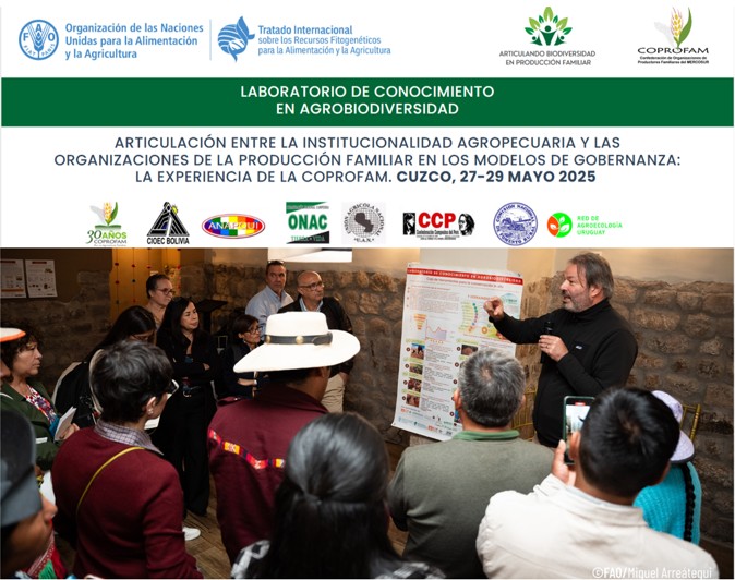 La Confederación Campesina del Perú, CCP, y la Confederación de Organizaciones de Productores Familiares del Mercosur Ampliado, COPROFAM, participaron en un encuentro internacional denominado Laboratorio de Conocimiento en Agrobiodiversidad que en el que se compartió la experiencia de COPROFAM para promover la articulación entre la institucionalidad agropecuaria y las organizaciones de la producción familiar en los modelos de gobernanza.